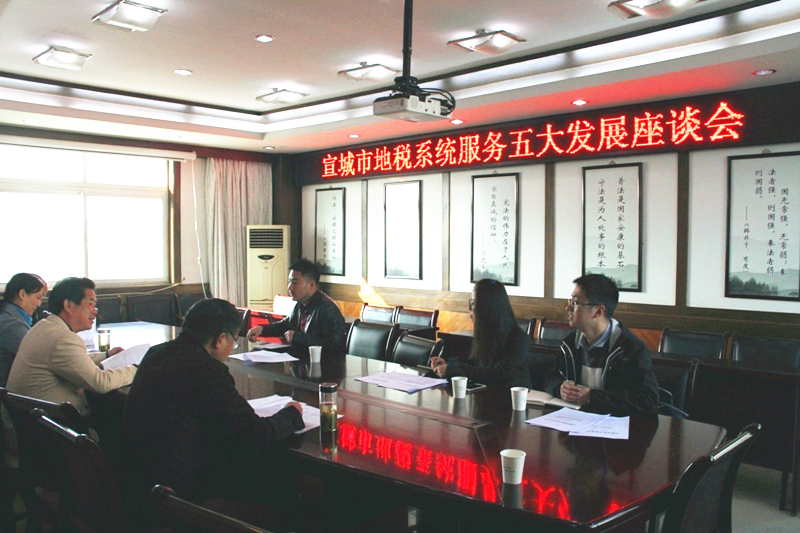 调研组一行首先与县局开展了服务五大发展工作座谈,县局相关业务股室负责人分别从小微企业、高新技术企业税收优惠政策落实;优化纳税服务;基金费优惠政策落实等方面汇报了服务五大发展的具体措施。县局党组书记、局长方建新在座谈中指出县地税部门从四个方面重点做好服务五大发展工作。一是更新理念,增强服务五大发展的责任感和使命感。二是突出优势,充分发挥地税部门在全县经济社会建设的职能作用。三是创新服务,促进全县社会经济协调有序发展。四是依法征收,提高服务和保障全县经济社会发展的能力水平。